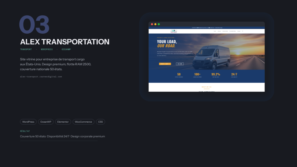 Notre site est devenu notre meilleur commercial. En 6 mois, les demandes de fret ont doublé à travers les 50 États. Carnes Digital a compris notre vision et l’a traduite en résultats concrets.